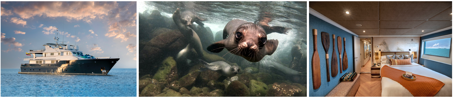 GALAPAGOS EXPLORER also has six beautifully appointed, air-conditioned en-suite cabins spread across three decks (including an upper deck master suite), and panoramic windows that fill the guest areas with natural light, and provide breath-taking views.